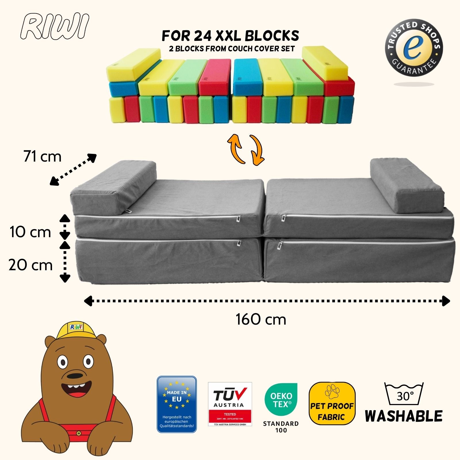 Mit dem RIWI® Couch Cover verwandelst du 24 XXL Bausteine in ein vollwertiges & gemütliches Spielsofa.