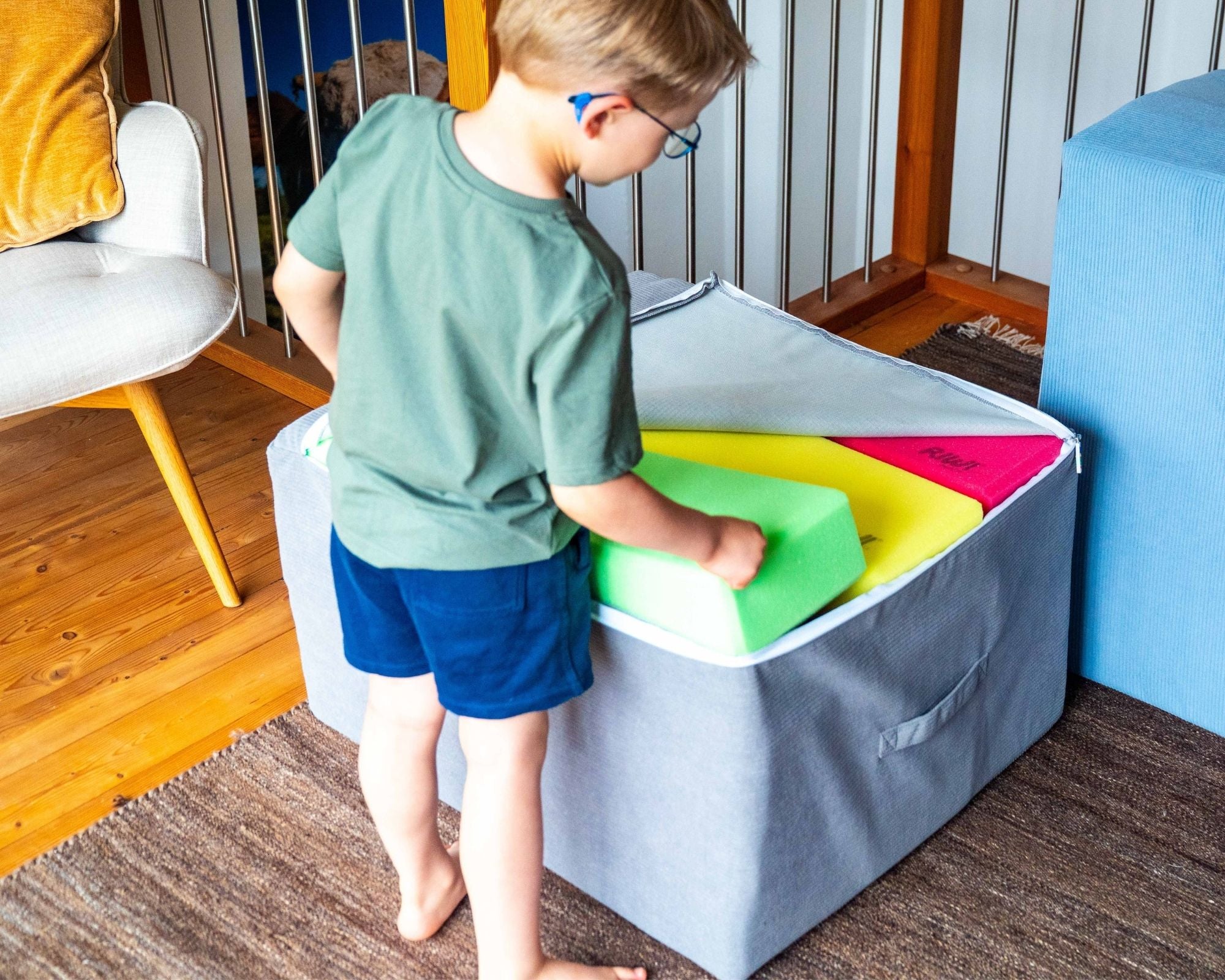 Mit dem RIWI® Couch Cover werden 24 XXL Bausteine zum gemütlichen Sofa – und das Kinderzimmer bleibt aufgeräumt.